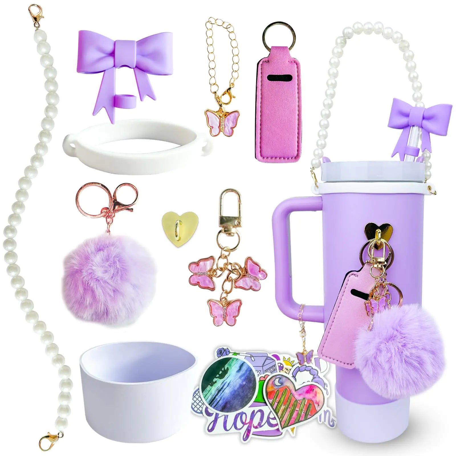 1x Pearl handle strap 1x Silicone bottle bottom cover 1x Water bottle sleeve 1x Butterfly silicone straw cover 1x Lipstick holder 1x Pom Pom 1x Heart hook 2x Butterfly keychain 10x Cute cartoon stickers