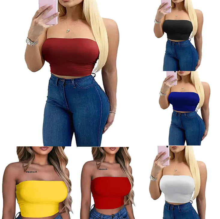Step into the spotlight with our sexy and slim-fit strapless T-shirt, designed for the modern woman who loves to express her style. Crafted from luxurious milk silk, this top is as comfortable as it is chic, making it a must-have addition to your wardrobe. Featuring a flattering super short length with a plain pattern, it effortlessly pairs with your favorite jeans, skirts, or shorts, allowing you to create versatile looks for any occasion. Whether you're dressing up for a night out or keeping it casual, this top has got you covered. Available in a variety of vibrant colors including White, Yellow, Red, Purple, Green, Black, Wine Red, Orange Red, Blue, and brown, you can choose the shade that best reflects your personality. Each color comes in sizes S, M, and L, ensuring a perfect fit for everyone. Elevate your wardrobe with this versatile piece that seamlessly blends comfort and style. Check out the stunning visuals to see how this T-shirt can transform your look.
