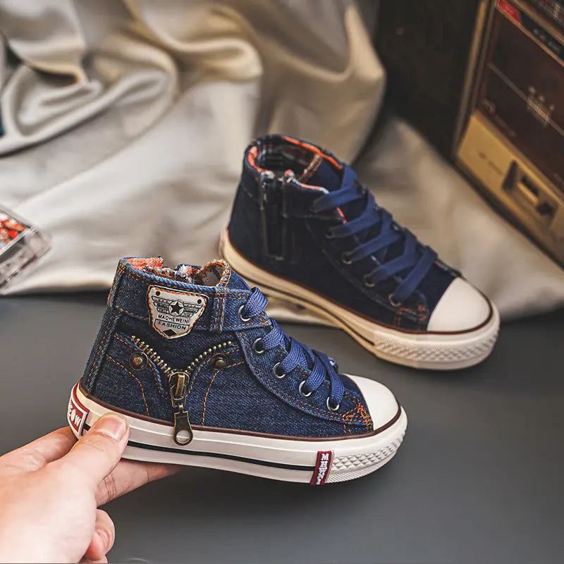 Introducing our stylish and functional high-top canvas shoes for kids, perfect for both boys and girls! Crafted from durable denim fabric, these shoes are designed to withstand the wear and tear of active play while providing comfort and support.