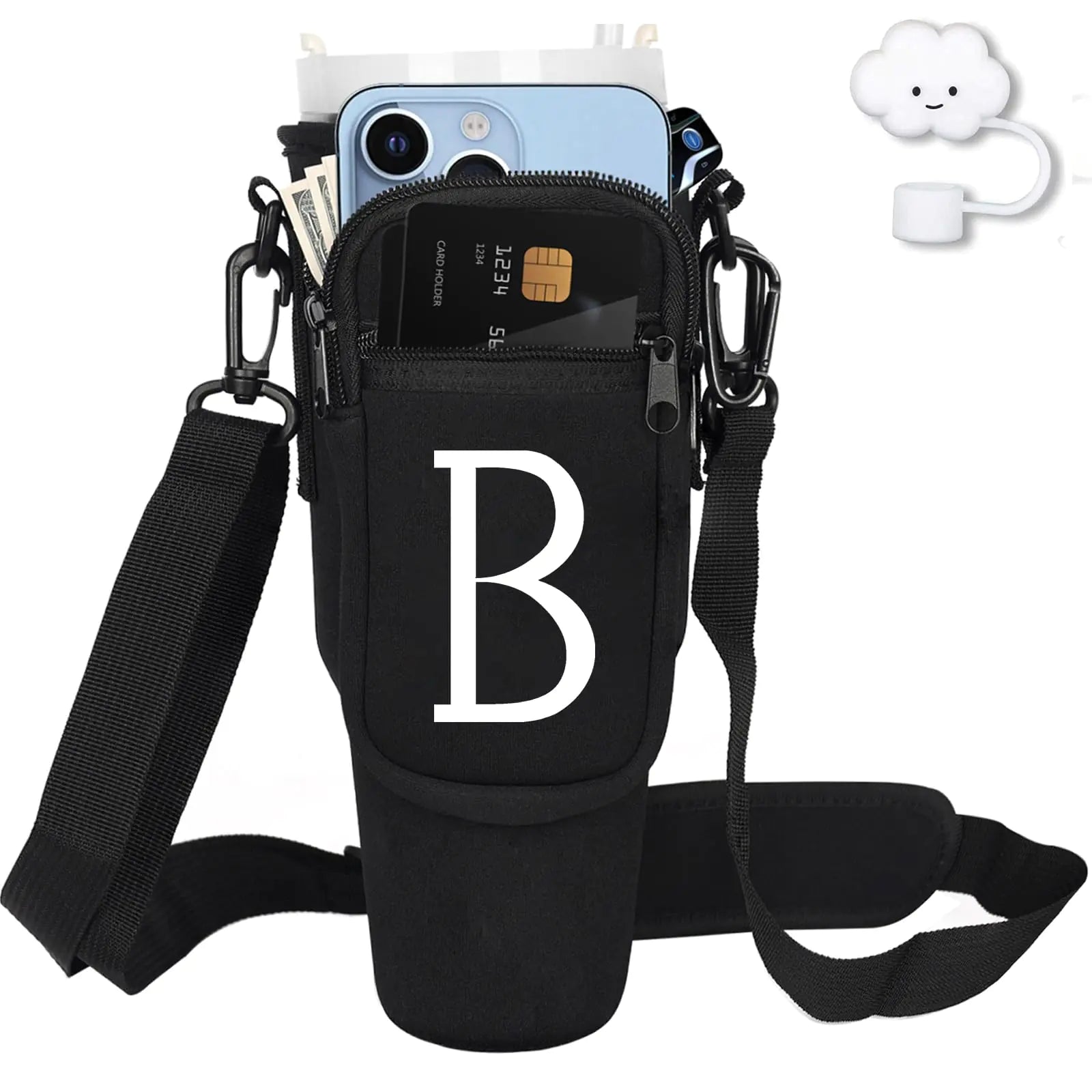 Style Loft Collection Water Bottle Carrier with Strap for Stanley 40 oz TumblerPersonalized Initial ID Name Stanley Bag with Phone Pocket Adjustable Strap Stanley Cup Accessories (B Black)